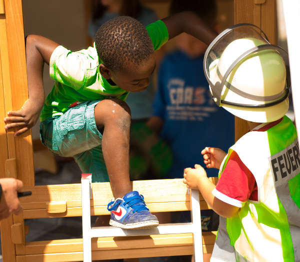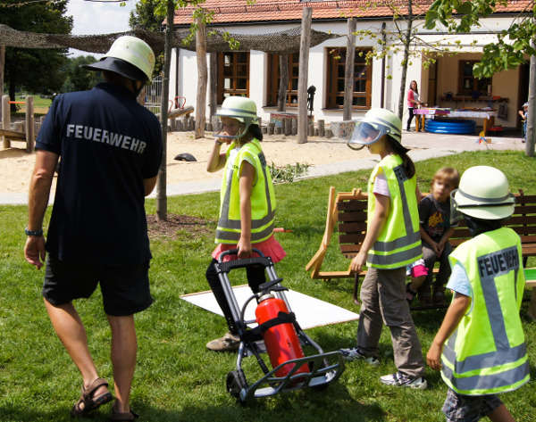 Tatüü- tataa. Tönt es aus einer original Feuerwehrsirene. Kinder kommen im Feuerwehroutfit mit ihrer Ausrüstung um die Ecke. Aus dem Fenster des Spielhauses dringen laute Rufe. „Hilfe Hilfe, in der Küche brennt es, wir können nicht raus!“ Jetzt muss es schnell gehen! „Angriffstrupp mit Löschgerät zur Brandbekämpfung und Rettungstrupp mit einer Leiter zur Menschenrettung - vor“
